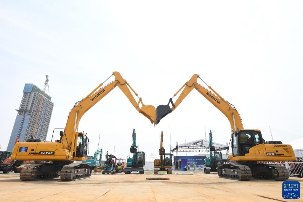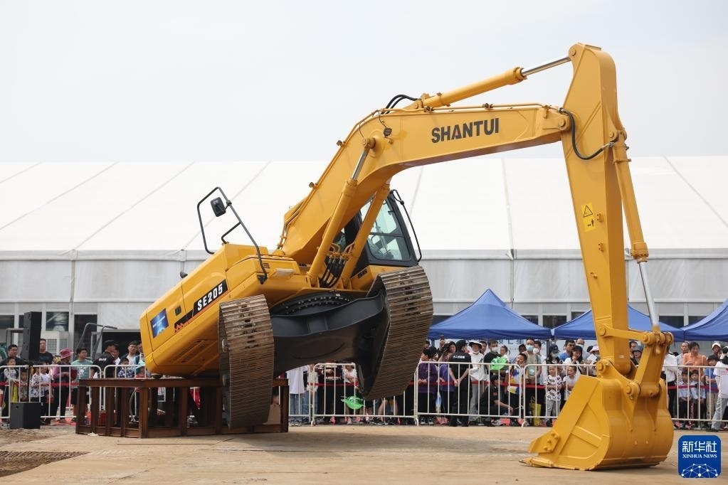 5月13日,在長沙國際工程機(jī)械展覽會(huì)上,機(jī)手駕駛挖掘機(jī)“比心”。