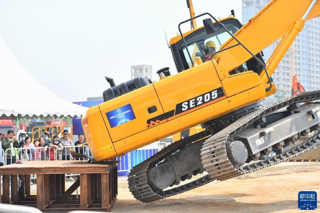 5月13日,在長沙國際工程機(jī)械展覽會(huì)上,機(jī)手駕駛挖掘機(jī)表演。
