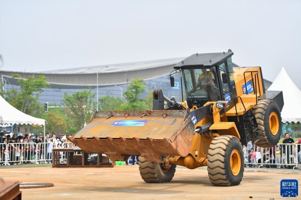 5月13日,在長沙國際工程機(jī)械展覽會(huì)上,機(jī)手駕駛裝載機(jī)表演。