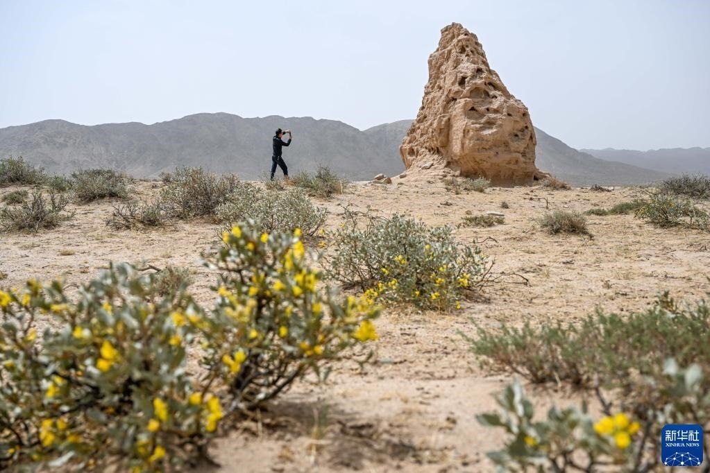 5月13日,駝峰(長城)文物保護隊員布音烏力吉在阿拉善左旗一處烽火臺遺址巡查并拍照記錄。