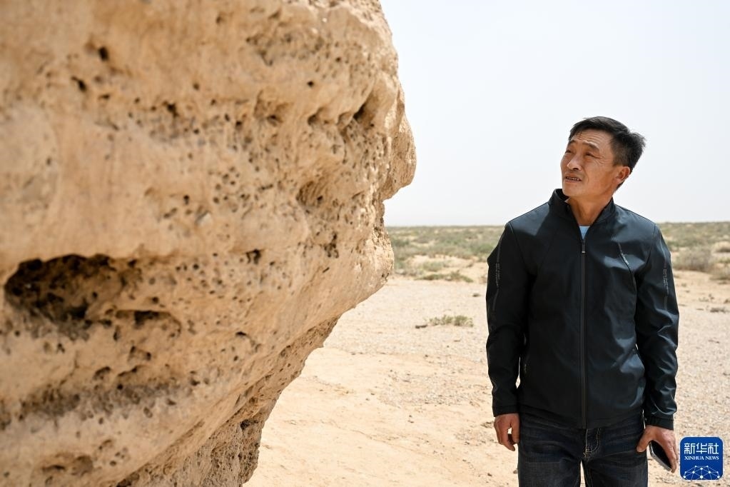 5月13日,駝峰(長城)文物保護隊員許繼龍在巡查阿拉善左旗一處石圈遺址。