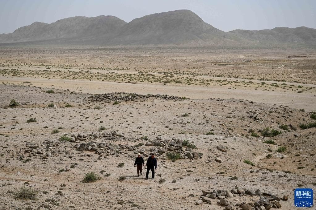 5月13日,駝峰(長城)文物保護隊員許繼龍(右)和烏仁其其格在巡查阿拉善左旗一處石圈遺址。
