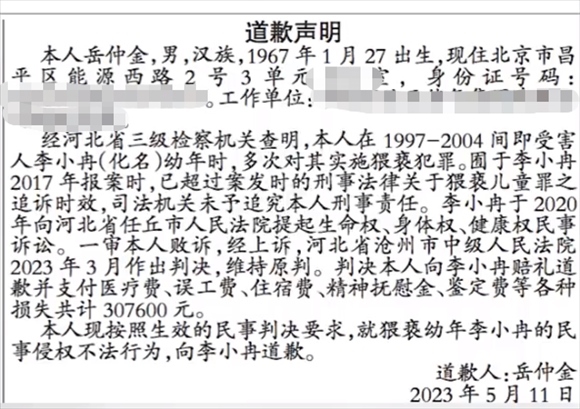 ·男子猥褻幼女因超追訴時(shí)效免于刑責(zé),民事訴訟敗訴后登報(bào)向受害人致歉。