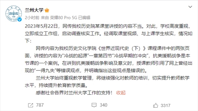 ·蘭州大學(xué)回應(yīng)教師課堂上“歪曲歷史”:教師引用網(wǎng)上曾經(jīng)出現(xiàn)的錯誤觀點(diǎn),并指出這些觀點(diǎn)是錯誤的。