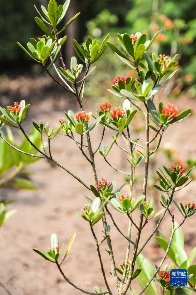 近日,在海南東寨港國家級自然保護區(qū)里的瀕危紅樹植物紅欖李迎來花期。據(jù)悉,紅欖李是珍稀瀕危紅樹植物、國家一級保護植物,被譽為紅樹林中的“大熊貓”。國內(nèi)一度僅存14株。2014年,海南東寨港國家級自然保護區(qū)管理局成功培育出紅欖李幼苗,并建立紅欖李野外種植基地。如今這里已有超過20畝、約2300株的紅欖李。