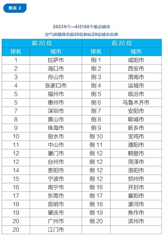 1—4月,168個重點(diǎn)城市中,拉薩、海口和舟山等城市空氣質(zhì)量相對較好(從第1名至并列第20名);咸陽、西安和渭南等城市空氣質(zhì)量相對較差(從倒數(shù)第1名至倒數(shù)第20名)。