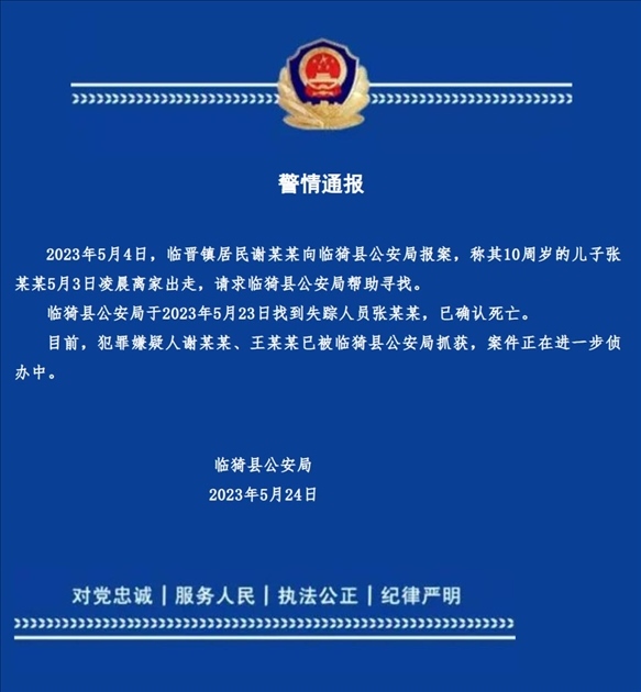 ·山西臨猗縣公安局發(fā)布警情通報(bào):10歲男孩失蹤身亡,嫌犯為生母和繼父。兩人曾流淚拍尋人視頻。