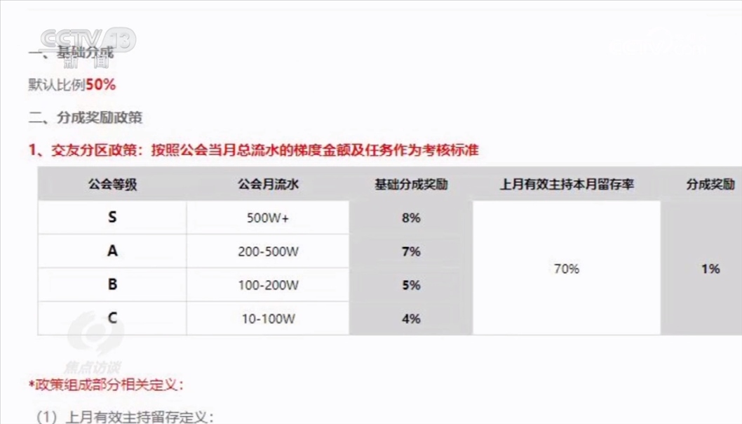 主播得到的打賞,平臺和經(jīng)紀機構都會參與分成。一般來說,平臺要首先分走50%的打賞費用,剩下的由主播和經(jīng)紀機構來分。從某平臺與主播經(jīng)紀公司的后臺約定中可以看出,當月總流水的梯度金額及任務作為考核。經(jīng)紀機構月流水超過500萬元,至少可以額外拿到8%的獎勵。在這種制度的激勵下,就推動經(jīng)紀公司和主播想方設法爭取更高額度的打賞。