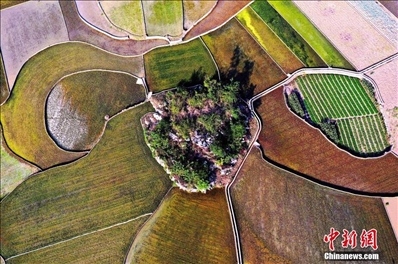航拍貴州萬峰林水田宛如天然“調色板”。