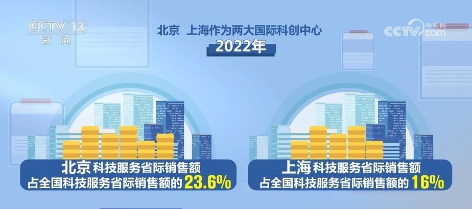 從創(chuàng)新來看,2017年—2022年,全國科技服務省際銷售額年均增長28%,較科技服務總體銷售收入增速快4.2個百分點。今年截至5月20日,科技服務省際銷售額同比增長29.7%,較科技服務總體銷售收入增速快2.6個百分點。北京、上海作為兩大國際科創(chuàng)中心,2022年科技服務省際銷售額分別占全國科技服務省際銷售額的23.6%和16%;2017年—2022年年均分別增長22.1%和24.2%。