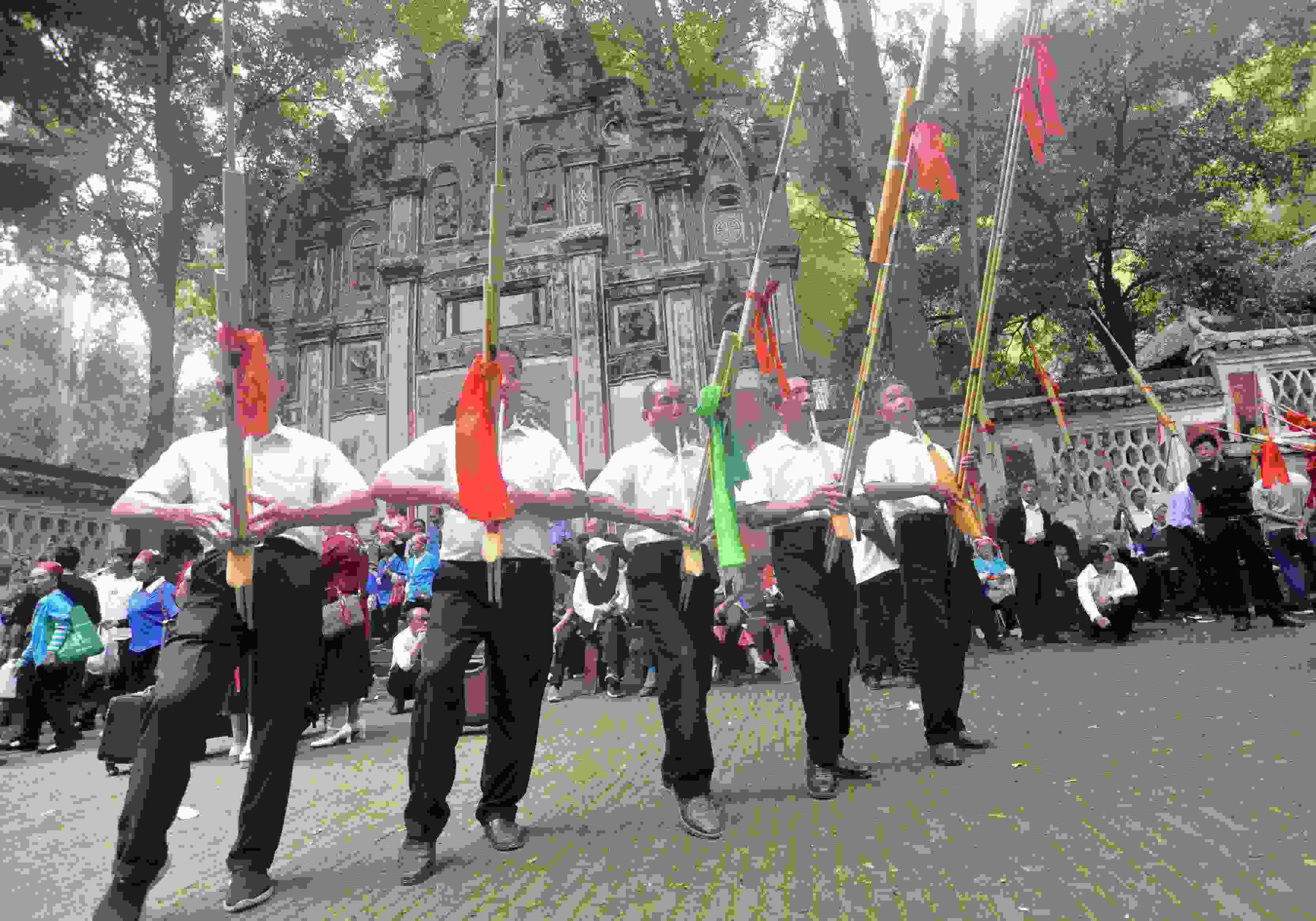 2023年5月26日,苗族同胞在貴州省黃平縣飛云崖景區(qū)給來賓敬攔門酒。當日是農歷四月初八,貴州省黔東南苗族侗族自治州黃平縣一年一度的苗族“四月八”系列活動拉開帷幕。苗族同胞身著盛裝開展吹蘆笙、踩鼓舞、對唱苗歌等系列民俗活動,并展示了泥哨、刺繡、銀飾及蠟染等非物質文化遺產技藝,吸引了眾多游客。(寧堅 楊忠)