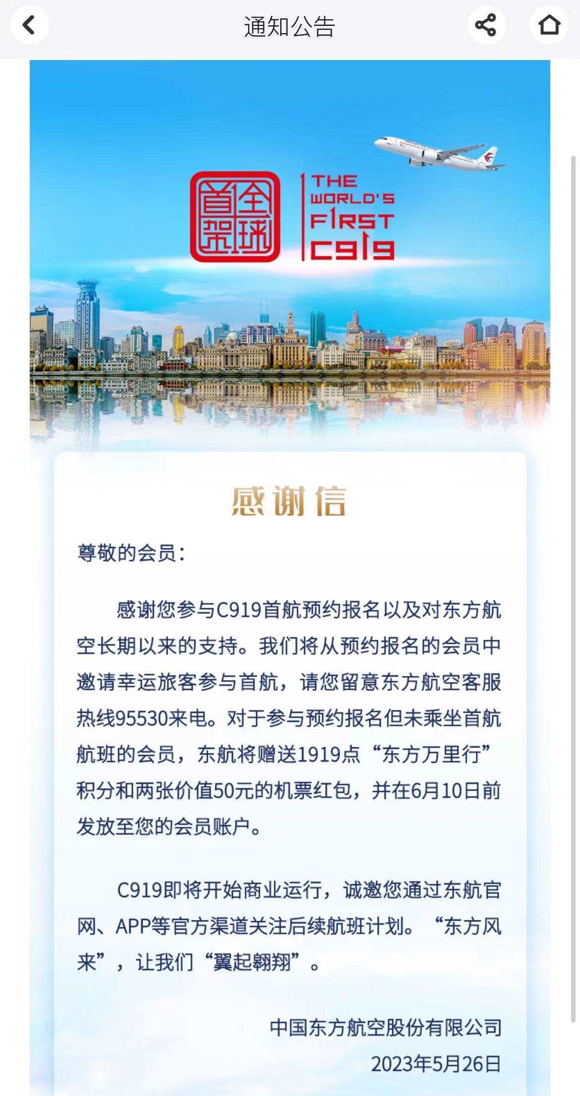 東航APP上還發(fā)布了一則感謝信,信中表示,C919即將開(kāi)始商業(yè)運(yùn)行,東航將從預(yù)約報(bào)名的會(huì)員中邀請(qǐng)幸運(yùn)旅客參與首航,對(duì)于參與預(yù)約報(bào)名但未乘坐首航航班的會(huì)員,東航將贈(zèng)送1919點(diǎn)“東方萬(wàn)里行”積分和兩張價(jià)值50元的機(jī)票紅包,并在6月10日前發(fā)放至?xí)T賬戶。