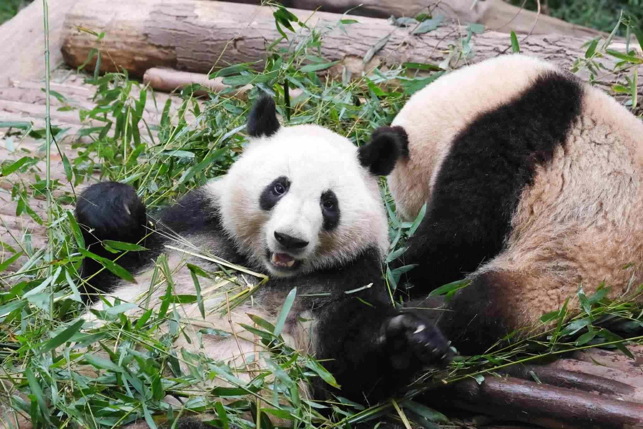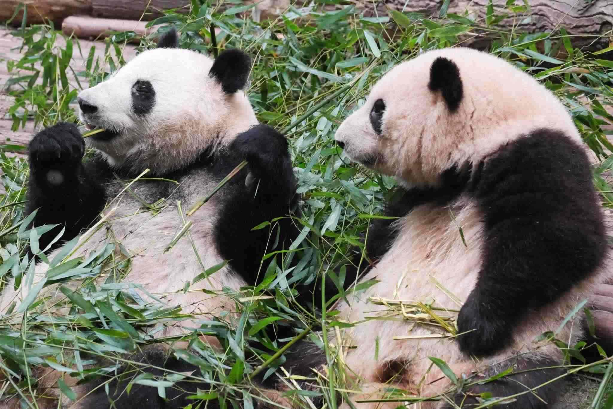 成都:大熊貓和花和葉姐弟早起吃竹子