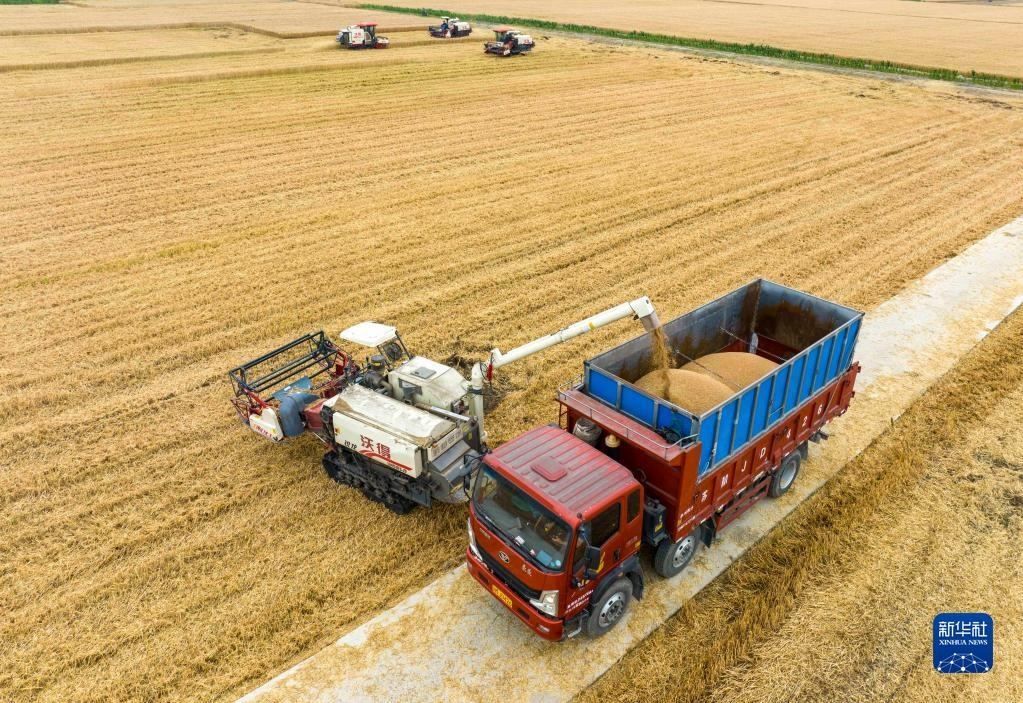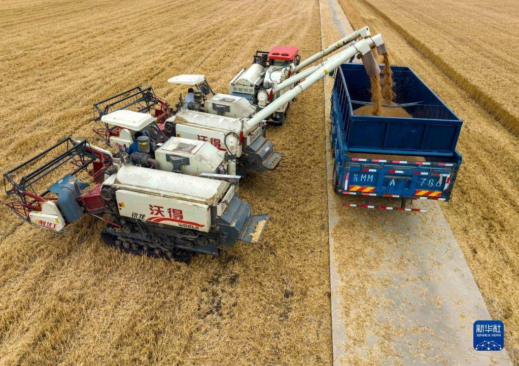 近日,江蘇省泰州市255萬畝小麥陸續(xù)進入收割期,當?shù)剞r(nóng)民搶抓晴好天氣加緊收割。農(nóng)機在田間穿梭,構(gòu)成了一幅美麗的豐收圖畫。
