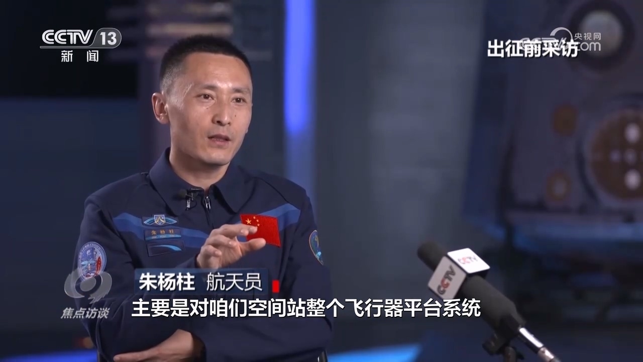 航天員朱楊柱:“我作為航天飛行工程師,主要對空間站整個飛行器平臺系統(tǒng)進行日常維護、保養(yǎng),同時也要照顧好很多試驗、實驗和一些艙內(nèi)外的載荷、科學(xué)機柜?!?/p>
