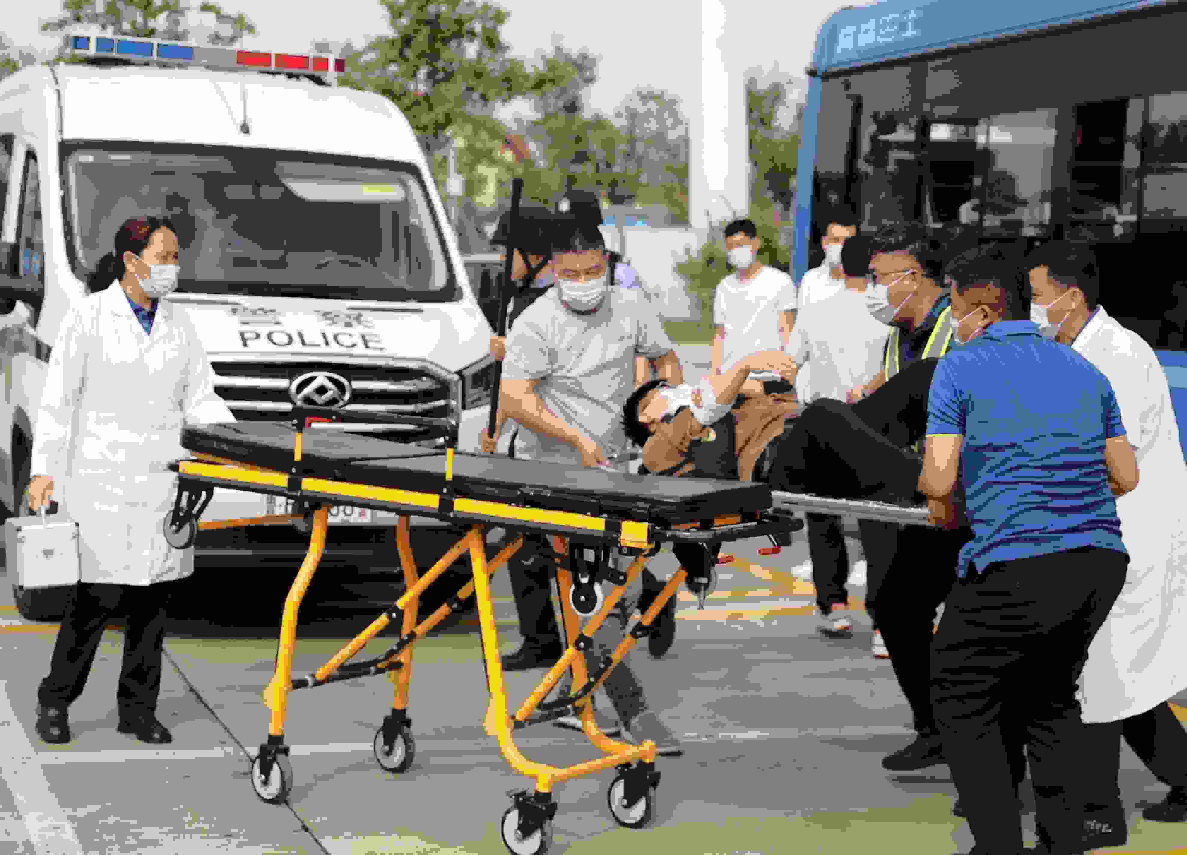 5月30日,120急救中心工作人員在進行運送傷員演練。(張進剛 攝)