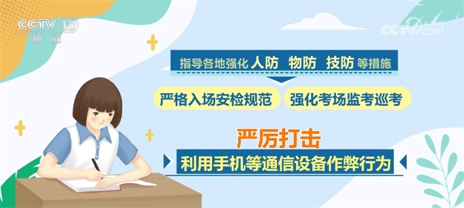 同時(shí),會(huì)同公安部、工業(yè)和信息化部等部門聯(lián)合開(kāi)展打擊作弊專項(xiàng)行動(dòng),將防范手機(jī)作弊作為重中之重,多措并舉、綜合施策,指導(dǎo)各地強(qiáng)化人防、物防、技防等措施,嚴(yán)格入場(chǎng)安檢規(guī)范,強(qiáng)化考場(chǎng)監(jiān)考巡考,嚴(yán)厲打擊利用手機(jī)等通信設(shè)備作弊行為。對(duì)于在高考中存在作弊行為的考生和人員,將依法依規(guī)嚴(yán)肅處理,堅(jiān)決維護(hù)高考的公平公正。