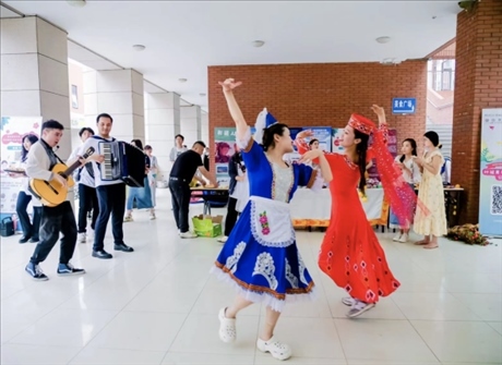 5月31日,“石榴籽 祖國行”新疆大學(xué)代表團來到南開大學(xué)。在故事分享會上,王彥臣、李姝洋、迪力亞爾·迪力夏提同學(xué)向南開大學(xué)青年學(xué)子講述了“斷臂男孩”阿卜杜外力·阿卜杜拉、“黨徽大叔”阿布都加帕爾·猛德和“時代楷?!崩R尼·巴依卡的故事。在文藝大舞臺上,新疆大學(xué)代表團各民族同學(xué)通過展示新疆特色舞蹈“木卡姆”、民族器樂“庫布孜”,向南開大學(xué)師生展現(xiàn)大美新疆熱情好客、能歌善舞的地域特色。