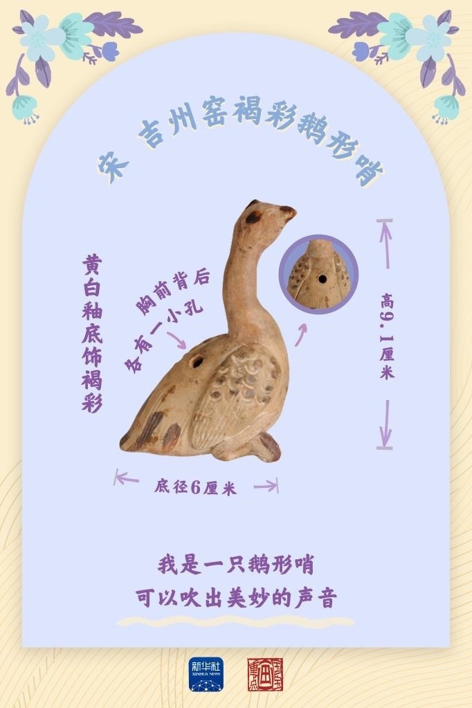 鵝形哨出土于江西吉安的宋代吉州窯遺址。吉安市博物館館長(zhǎng)李希朗說(shuō),吉州窯的瓷土粗松,有近似于陶的特點(diǎn),可塑性較強(qiáng)。這里出土的瓷塑大多不超過(guò)10厘米,動(dòng)物瓷塑的原型多為社會(huì)生活中所常見(jiàn)。從出土的瓷塑數(shù)量來(lái)看,吉州窯當(dāng)年的訂單量很大,頗受市場(chǎng)歡迎。也許每一只鵝形哨的背后,都有一名鼓著腮幫子的稚童。歷經(jīng)時(shí)光荏苒,鵝形哨到今天還能發(fā)出動(dòng)聽(tīng)的哨音。