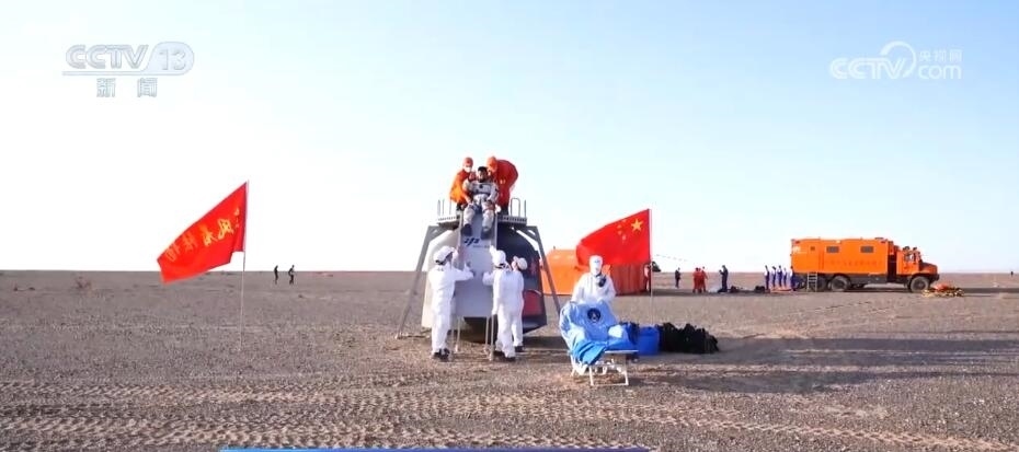 總臺記者 郭靜:在返回艙降落后處于直立狀態(tài)時,我旁邊的這個操作平臺就發(fā)揮了大作用,它采用鎂鋁合金材質(zhì),相較之前更加輕便了,處置隊員從飛機(jī)降落后到搭建好操作平臺也就需要5分鐘左右的時間。除了輕便以外呢,它的滑梯坡度也更加平緩了,航天員下滑時也會更加舒適。