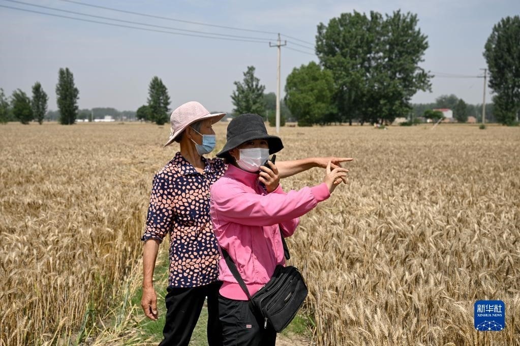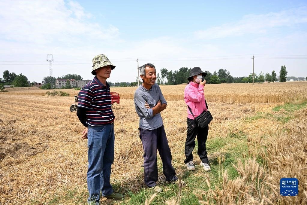 6月2日,在安徽省阜陽市阜南縣許堂鄉(xiāng)劉崗村,陳麗娟和村民確認收割費用。