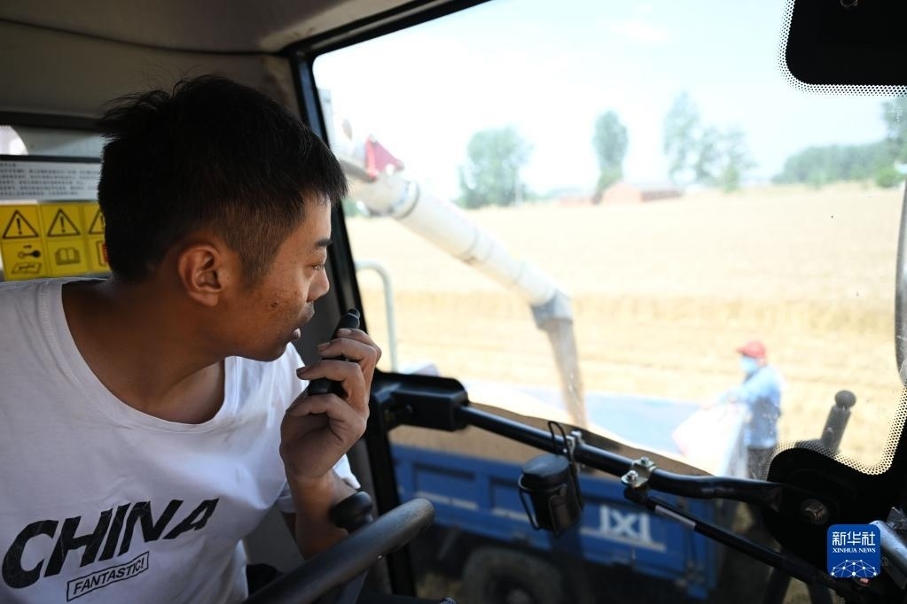 6月2日,在安徽省阜陽市阜南縣許堂鄉(xiāng)劉崗村,董斐斐駕駛收割機為村民收割小麥。