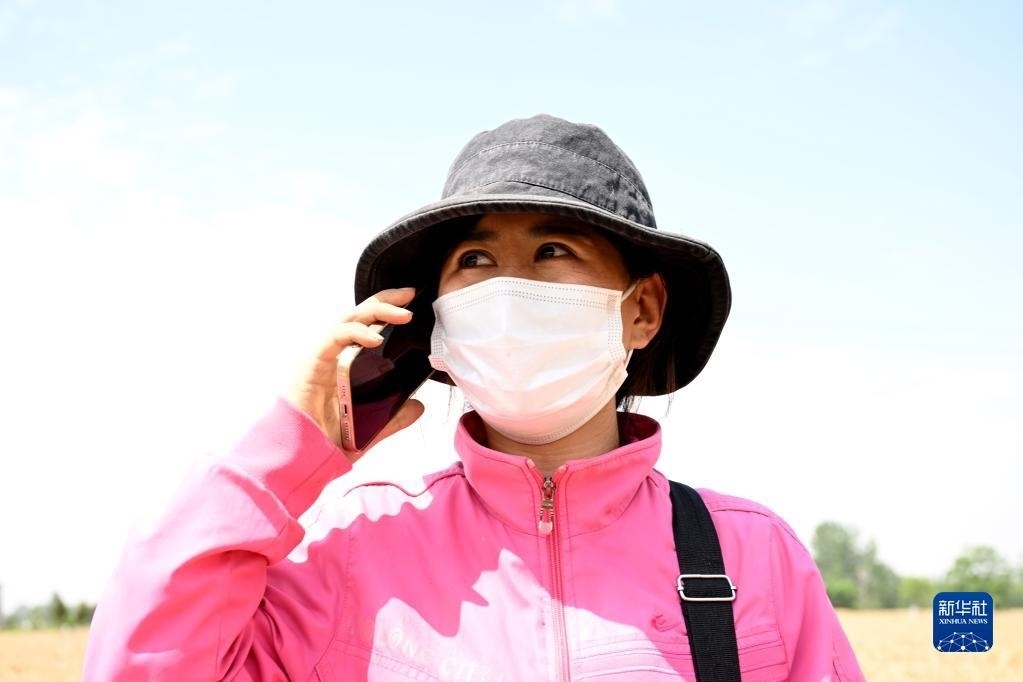 6月2日,在安徽省阜陽市阜南縣許堂鄉(xiāng)劉崗村,陳麗娟和朋友電話聯(lián)系下一站的收割業(yè)務。