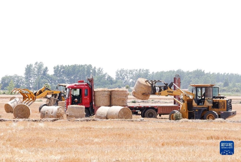 6月3日,在泗洪縣龍集鎮(zhèn)勒東村,農(nóng)機(jī)手將打捆好的秸稈運(yùn)輸離田。   新華社發(fā)(許昌亮 攝)