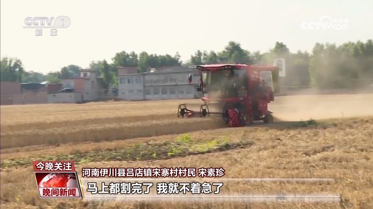 伊川縣呂店鎮(zhèn)宋寨村村民 宋素珍:前幾天下雨小麥?zhǔn)詹换貋?lái),心里可心慌,鄉(xiāng)里派履帶式收割機(jī),我這十幾畝地馬上都挨?。ㄝ喌剑┝耍R上都割完了,我就不著急了。