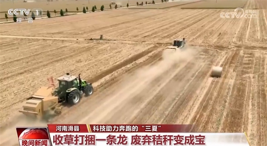 在河南滑縣上官鎮(zhèn)的麥田里,多種農(nóng)機(jī)正在聯(lián)合作業(yè)。在收割機(jī)后面緊跟著的是摟草機(jī)和秸稈打捆機(jī),摟草機(jī)將散落的秸稈摟成行,打捆機(jī)緊跟著吸附秸稈、收草打捆。運(yùn)輸車(chē)輛將碼好的秸稈拉往養(yǎng)殖場(chǎng)、發(fā)電廠(chǎng)進(jìn)行綜合利用。