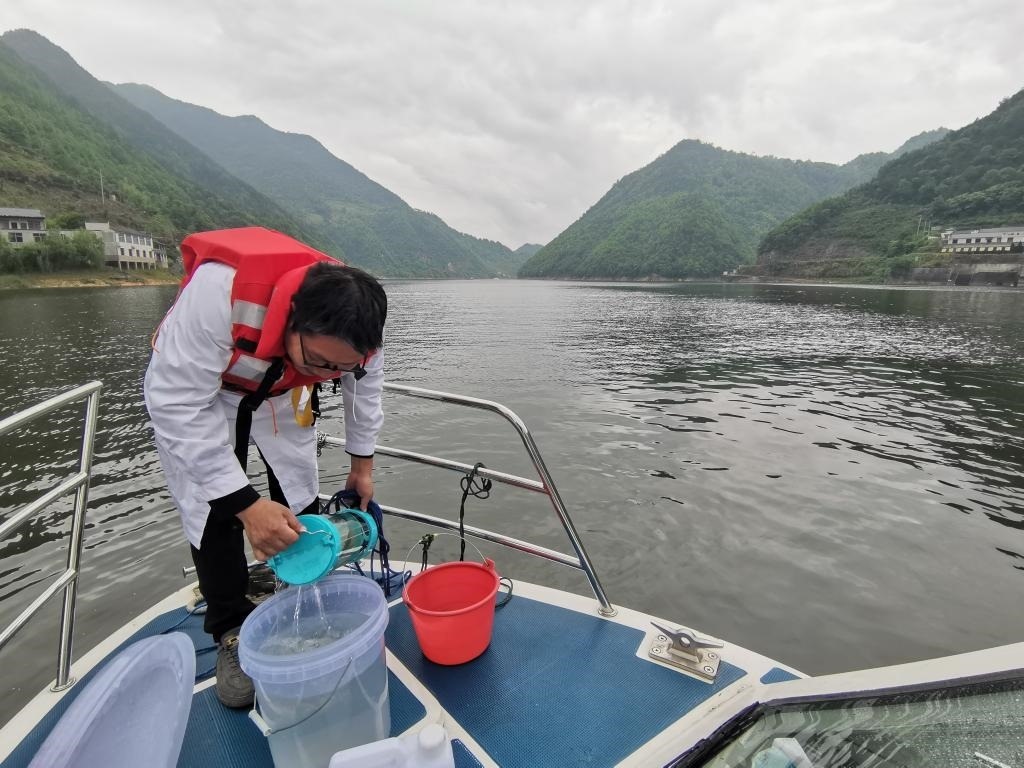圖為5月24日,生態(tài)環(huán)保工作者在新安江皖浙兩省交界處,把從新安江中取出的水樣倒進桶里。 新華社記者劉方強 攝
