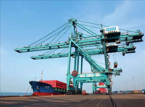 船舶??吭诤颖秉S驊港綜合港區(qū)集裝箱碼頭進(jìn)行卸船作業(yè)(2023 年 3 月 9 日攝)駱學(xué)峰攝 / 本刊