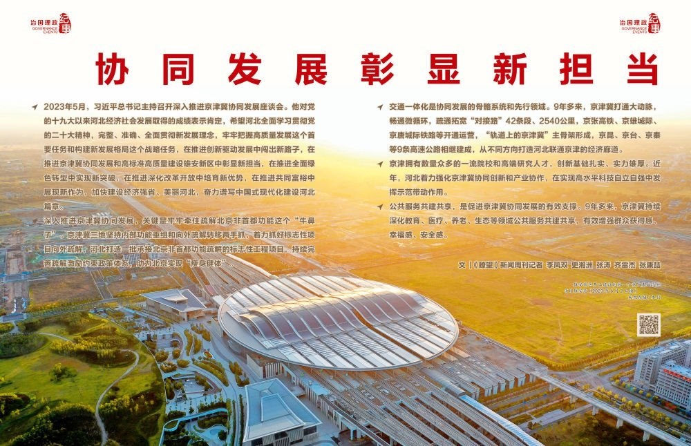◇2023年5月,習(xí)近平總書記主持召開(kāi)深入推進(jìn)京津冀協(xié)同發(fā)展座談會(huì)。他對(duì)黨的十九大以來(lái)河北經(jīng)濟(jì)社會(huì)發(fā)展取得的成績(jī)表示肯定,希望河北全面學(xué)習(xí)貫徹黨的二十大精神,完整、準(zhǔn)確、全面貫徹新發(fā)展理念,牢牢把握高質(zhì)量發(fā)展這個(gè)首要任務(wù)和構(gòu)建新發(fā)展格局這個(gè)戰(zhàn)略任務(wù),在推進(jìn)創(chuàng)新驅(qū)動(dòng)發(fā)展中闖出新路子,在推進(jìn)京津冀協(xié)同發(fā)展和高標(biāo)準(zhǔn)高質(zhì)量建設(shè)雄安新區(qū)中彰顯新?lián)?dāng),在推進(jìn)全面綠色轉(zhuǎn)型中實(shí)現(xiàn)新突破,在推進(jìn)深化改革開(kāi)放中培育新優(yōu)勢(shì),在推進(jìn)共同富裕中展現(xiàn)新作為,加快建設(shè)經(jīng)濟(jì)強(qiáng)省、美麗河北,奮力譜寫中國(guó)式現(xiàn)代化建設(shè)河北篇章。