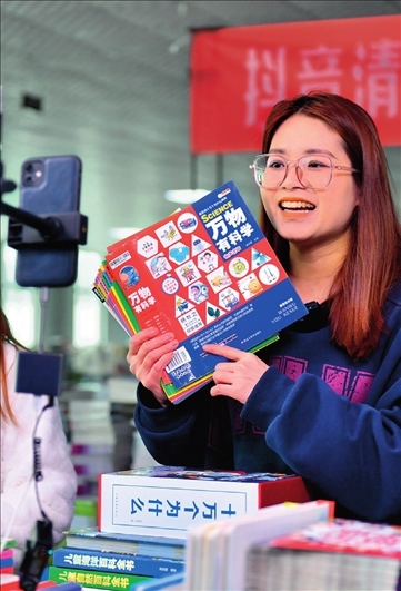 廊坊市永清經(jīng)濟(jì)開(kāi)發(fā)區(qū)京聯(lián)集團(tuán)館配圖書聯(lián)合現(xiàn)采基地,工作人員在電商平臺(tái)直播銷售圖書(2023 年 3 月 26 日攝) 駱學(xué)峰攝 / 本刊