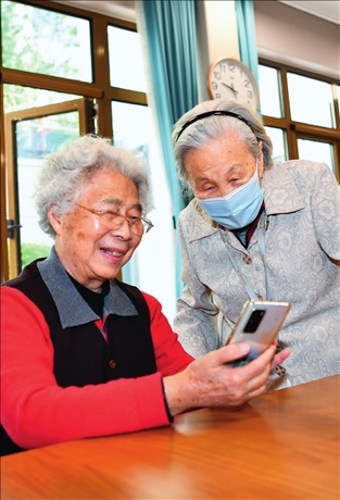 老人在位于河北三河的燕達(dá)金色年華健康養(yǎng)護(hù)中心老年活動(dòng)室交談(2022年5月18日攝)朱旭東攝 / 本刊