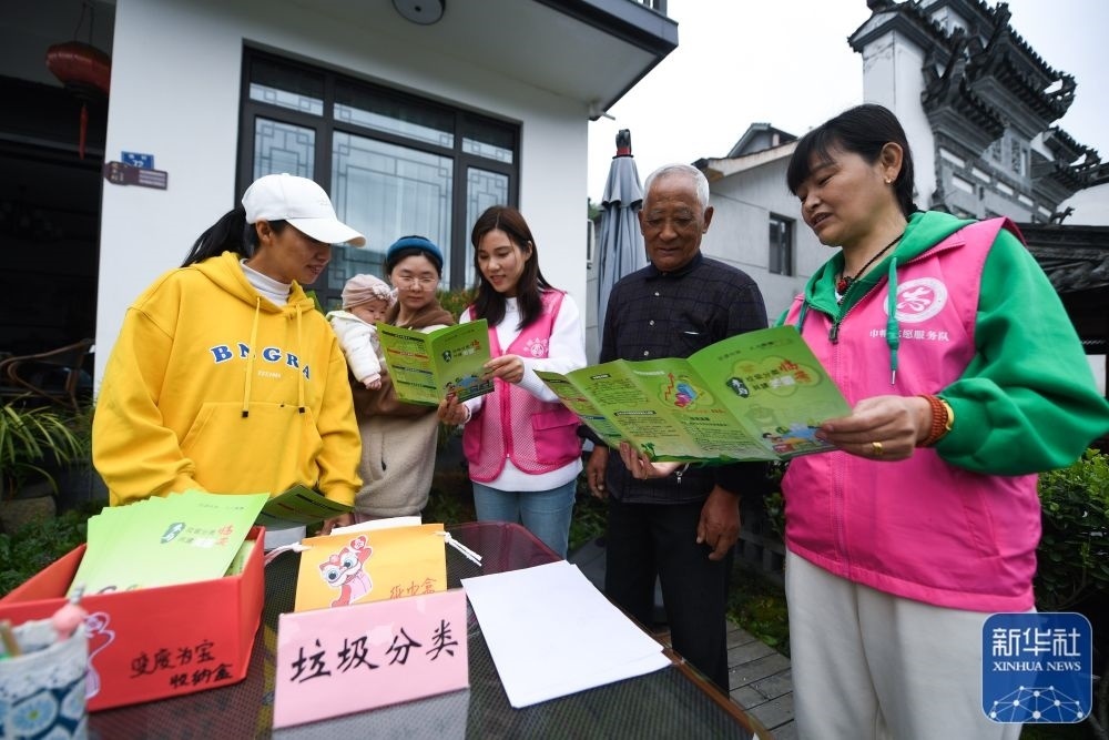浙江杭州市臨安區(qū)湍口鎮(zhèn)婦聯(lián)組織黨員志愿者在庭院里給村民普及垃圾分類知識,并介紹如何變廢為寶,用廢舊物品美化環(huán)境(2022年4月14日攝)。新華社記者 徐昱 攝