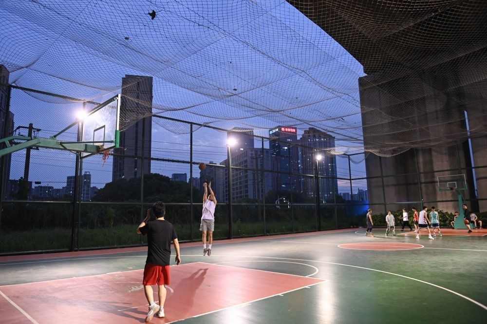 2022年9月20日,市民在位于高鐵橋下的錢江世紀(jì)城體育公園打籃球。在杭州,一批運(yùn)動(dòng)場館見縫插針地“嵌入”市民生活圈,城市空間的“邊角余料”正成為全民健身的“金角銀邊”。新華社記者 黃宗治 攝