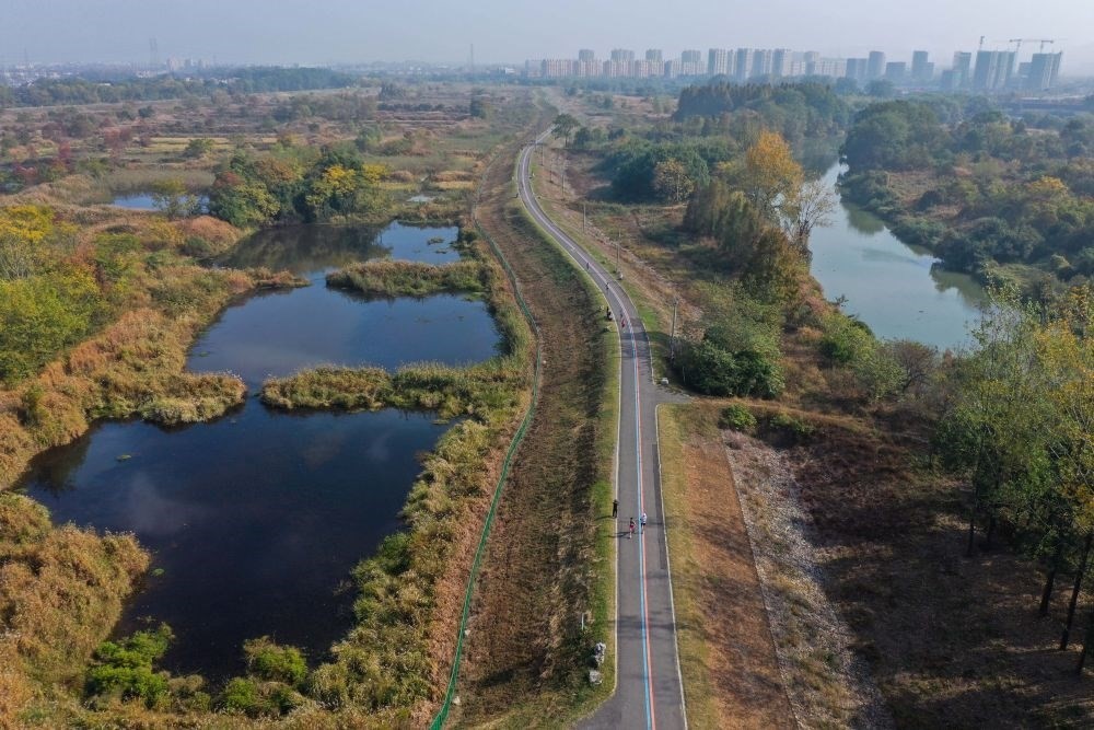 2022年11月12日,運(yùn)動(dòng)愛好者們在浙江省杭州市余杭區(qū)瓶窯鎮(zhèn)北湖草蕩生態(tài)濕地的健身游步道上參加健康跑比賽(無人機(jī)照片)。新華社記者 徐昱 攝
