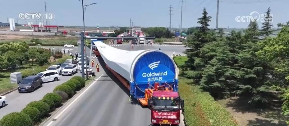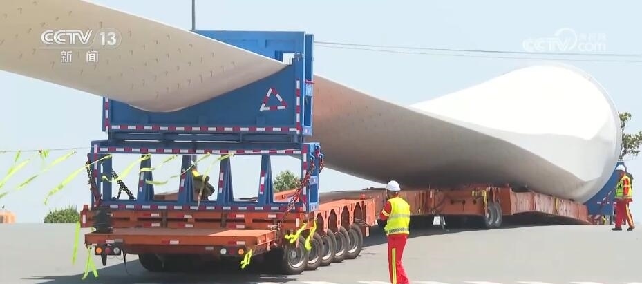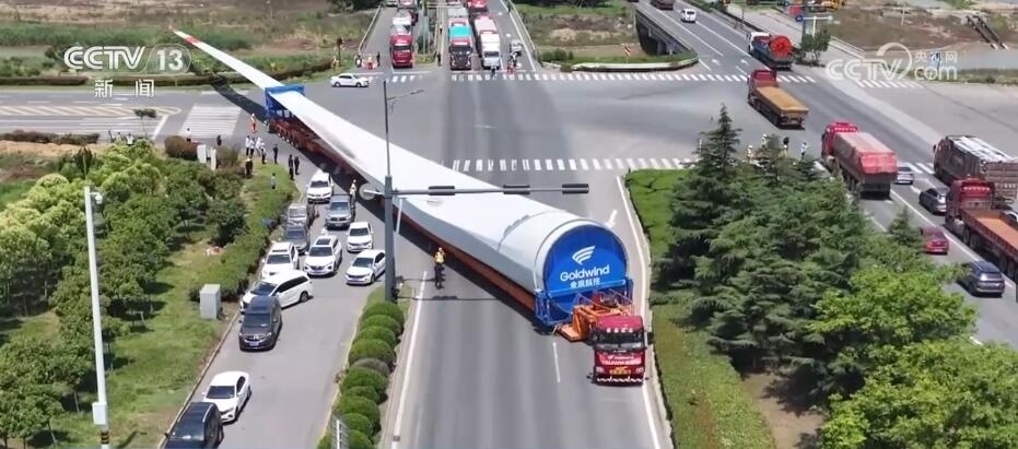 央視網(wǎng)消息:今天(6月14日)上午,100%我國自主知識產(chǎn)權(quán)的123米超長海上風(fēng)電葉片在江蘇連云港啟動陸地轉(zhuǎn)運工作。上午9時,代表著我國風(fēng)電裝備最新技術(shù)水準(zhǔn)的大葉片,從廠區(qū)到港口碼頭,陸地運輸全程約30公里,耗時約3到4個小時,其中運輸大葉片的車輛還要拐過90度的直角彎。如此大體量的裝備運輸是一個復(fù)雜的過程,其中有哪些技術(shù)難點?來看記者今天上午從現(xiàn)場發(fā)回的報道。