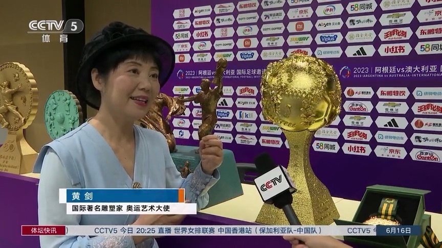 在本場比賽開始前,賽事組織者特意為兩隊隊長頒發(fā)了比賽紀念獎杯,它們的設計者是國際著名雕塑家黃劍,她曾為六屆奧運會創(chuàng)作過雕塑作品。為迎接本場國際邀請賽,黃劍共設計了10件足球藝術品,部分作品作為禮物贈予球員。