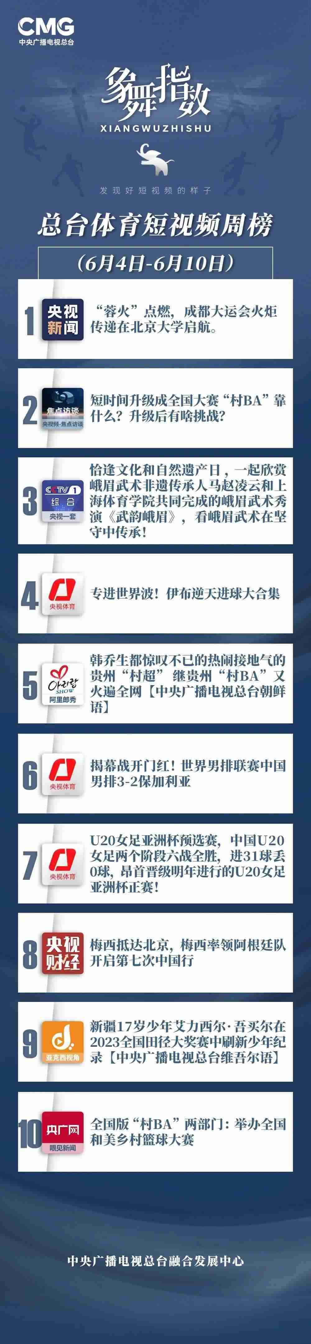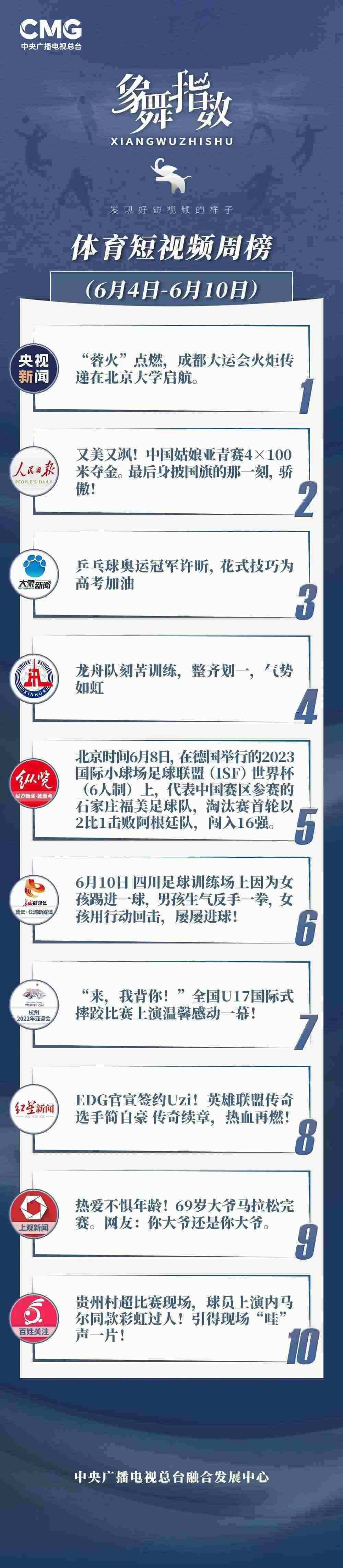 中央廣播電視總臺(tái)“象舞指數(shù)”評(píng)議品牌,推出體育短視頻周榜、總臺(tái)體育短視頻周榜。在6月4日—6月10日,以下內(nèi)容獲得矚目: