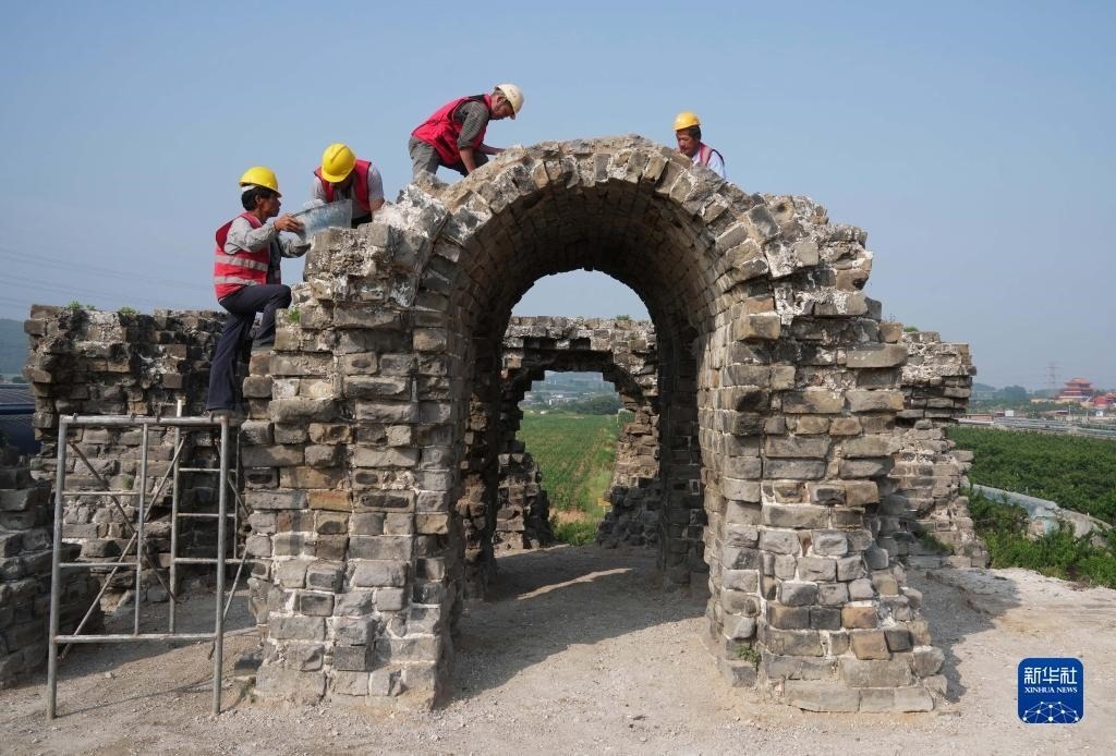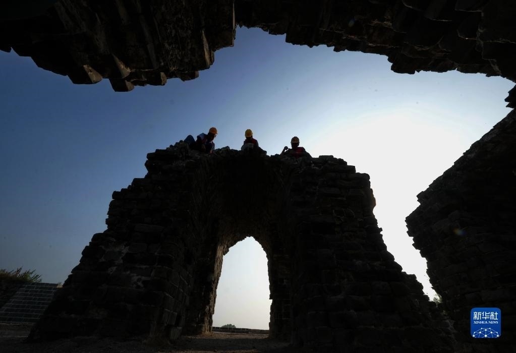 6月15日,工人在山海關(guān)長城腰鋪9號敵臺修繕工地施工。