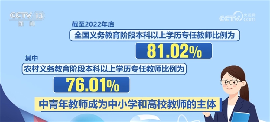 近年來,“特崗計(jì)劃”、“三區(qū)”人才支持計(jì)劃教師專項(xiàng)計(jì)劃等源源不斷地為鄉(xiāng)村學(xué)校補(bǔ)充高素質(zhì)教師。優(yōu)師計(jì)劃、師范教育協(xié)同提質(zhì)計(jì)劃、國優(yōu)計(jì)劃等的實(shí)施,也在助力優(yōu)秀教師的培養(yǎng)。我國各級各類教師隊(duì)伍學(xué)歷不斷提高、年齡結(jié)構(gòu)不斷優(yōu)化。截至2022年底,全國義務(wù)教育階段本科以上學(xué)歷專任教師比例為81.02%,其中,農(nóng)村義務(wù)教育階段本科以上學(xué)歷專任教師比例為76.01%,中青年教師成為中小學(xué)和高校教師的主體。