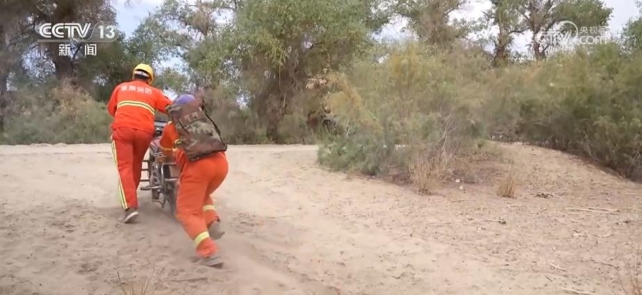 因為管護面積大,中午護林員只能用攜帶的干糧充饑。為了近距離查看胡楊樹的情況,他們大多數時候要在林中小路里穿梭。有的地方路況不好,就需要推著摩托車行走,難免遇到連人帶車陷進沙地里的情況,要格外小心。
