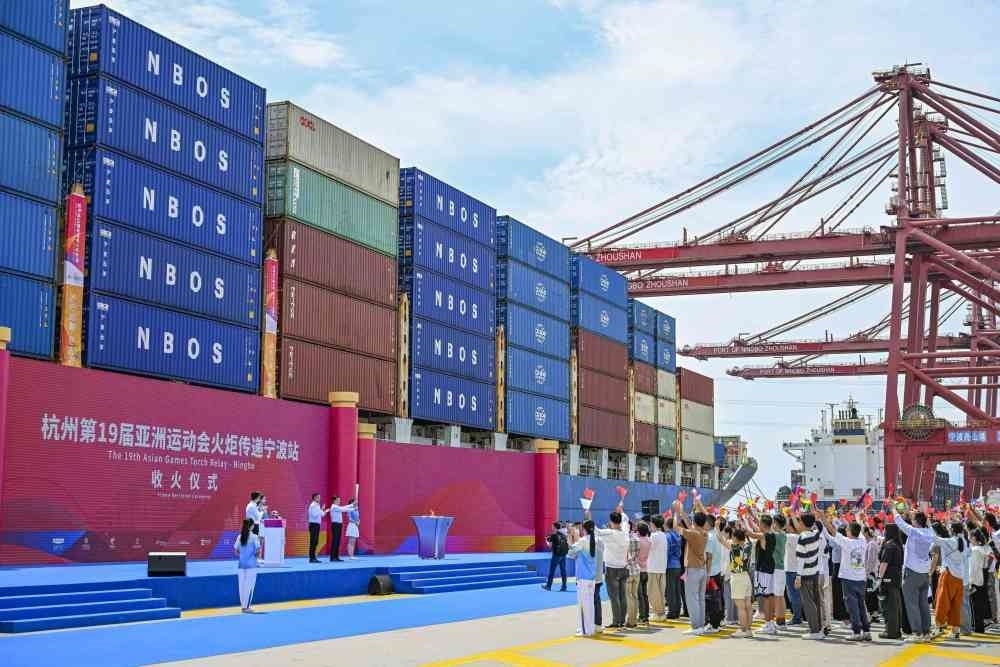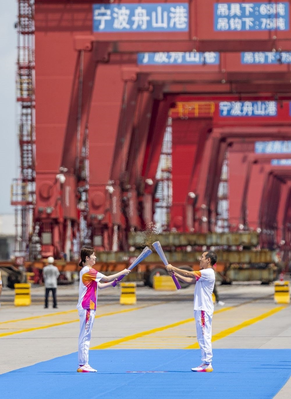 ↑這是杭州亞運(yùn)會(huì)火炬?zhèn)鬟f寧波站收火儀式現(xiàn)場。
