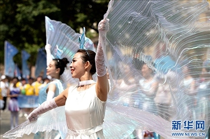 在哈爾濱市中央大街上,人們參加巡游慶祝活動。