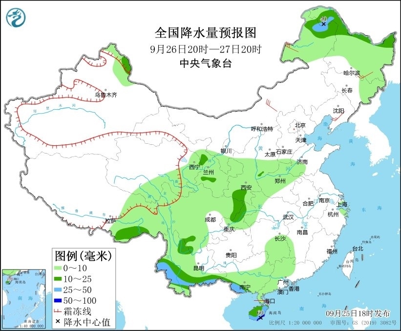 圖1 全國降水量預報圖(9月25日20時-26日20時)