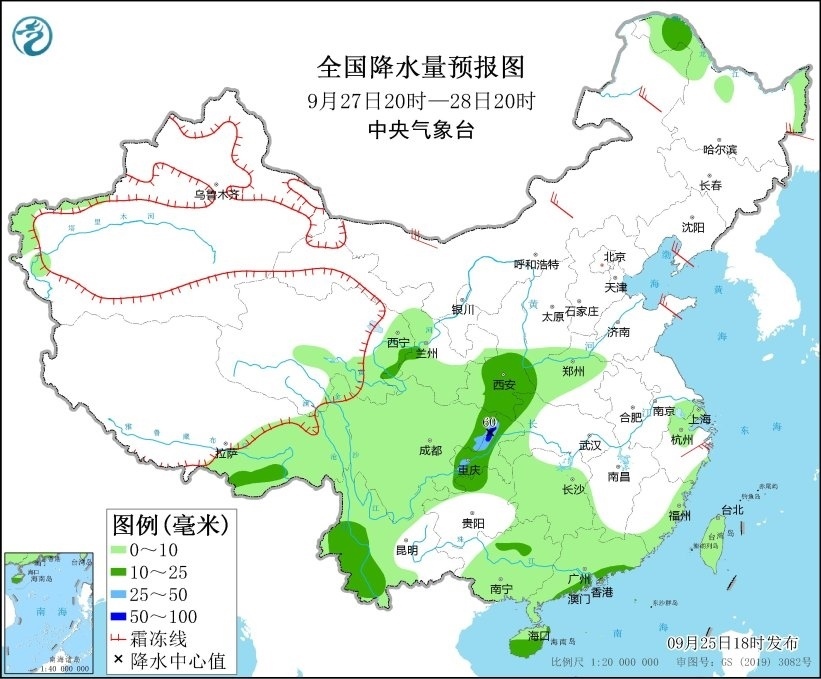9月25日20時至26日20時,廣東西南部、廣西南部、海南島以及新疆北疆北部、西藏東南部、陜西南部等地部分地區(qū)有中到大雨,其中,海南島東部和南部等地部分地區(qū)有暴雨或大暴雨(100~180毫米)。另外,新疆阿勒泰山區(qū)有雨夾雪或雪。內蒙古中西部、山東半島等地部分地區(qū)有4~6級風(見圖1)。