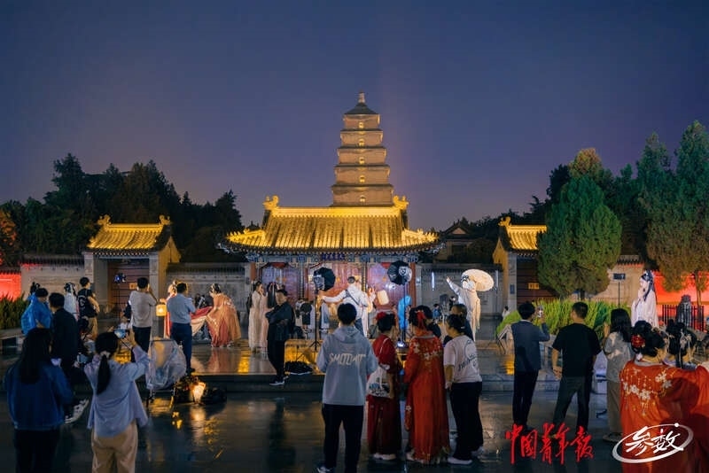 在西安大唐不夜城景區(qū),身著華服的年輕人以大雁塔為背景,拍攝照片。中青在線記者 白楊/攝