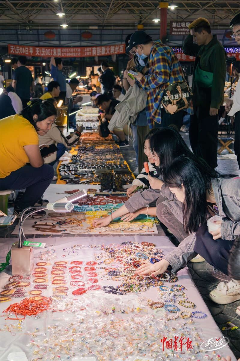 夜幕降臨,北京潘家園舊貨市場內(nèi)的周三夜場開啟,攤位上亮起了一盞盞照明的小燈,很多年輕人正在攤位前選購商品。實習(xí)生 邱嵐/攝